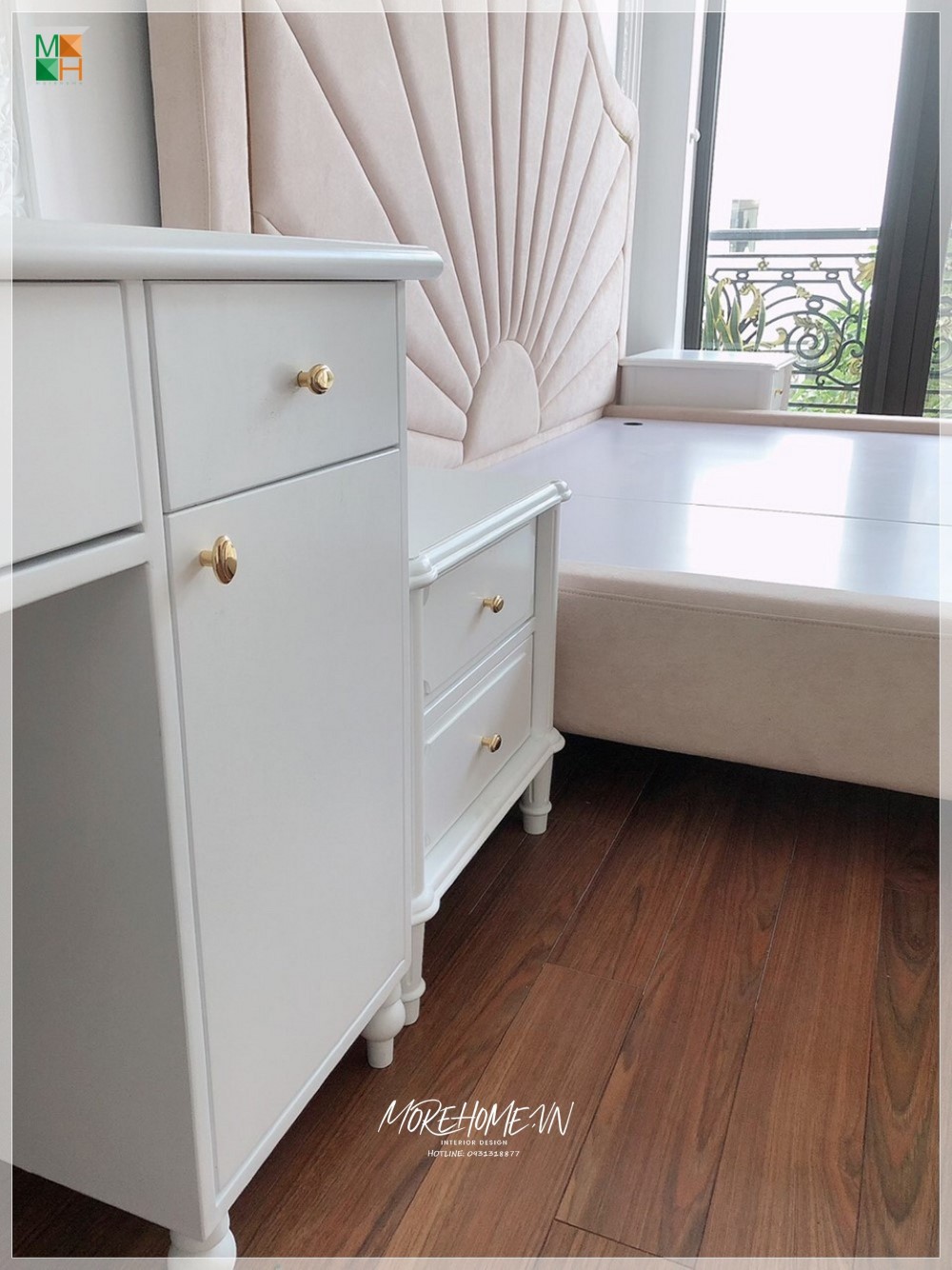 Thi công tab đầu giường tân cổ điển để trang trí thêm không gian, tạo ra một nơi thuận tiện để đặt đèn ngủ.